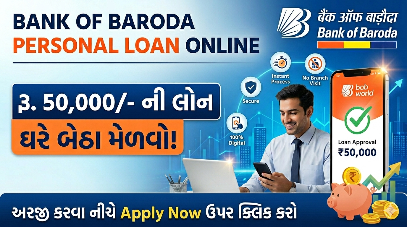 બેંક ઓફ બરોડા (BoB) માંથી ₹૫૦,૦૦૦ ની પર્સનલ લોન મેળવવાની પ્રક્રિયા હવે સંપૂર્ણપણે ડિજિટલ અને પેપરલેસ થઈ ગઈ છે. તમે ઘરે બેઠા ‘bob World’ એપ અથવા બેંકની વેબસાઇટ દ્વારા આ લોન માટે અરજી કરી શકો છો.